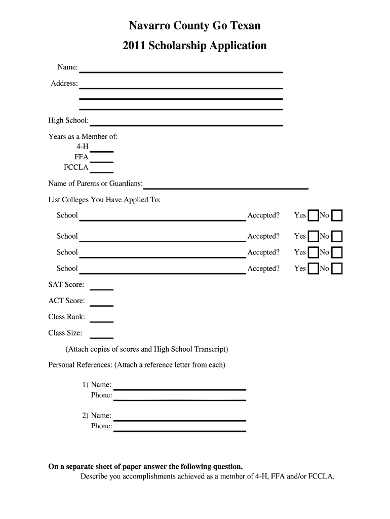 Students who are residents of Navarro County, Texas, and are planning to attend an accredited higher education institution are required to file the Navarro County Go Texan 2011 Scholarship Application.