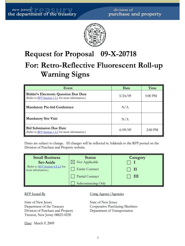 This document is a Request for Proposal (RFP) issued by the State of New Jersey's Department of the Treasury for bidding on the provision of retro-reflective fluorescent roll-up warning signs. It