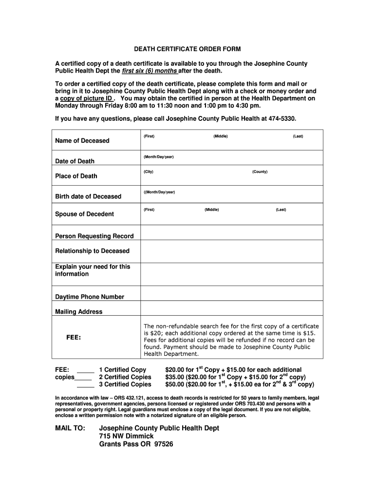 Get the free Birth and death certificate order forms - Josephine County - co josephine or