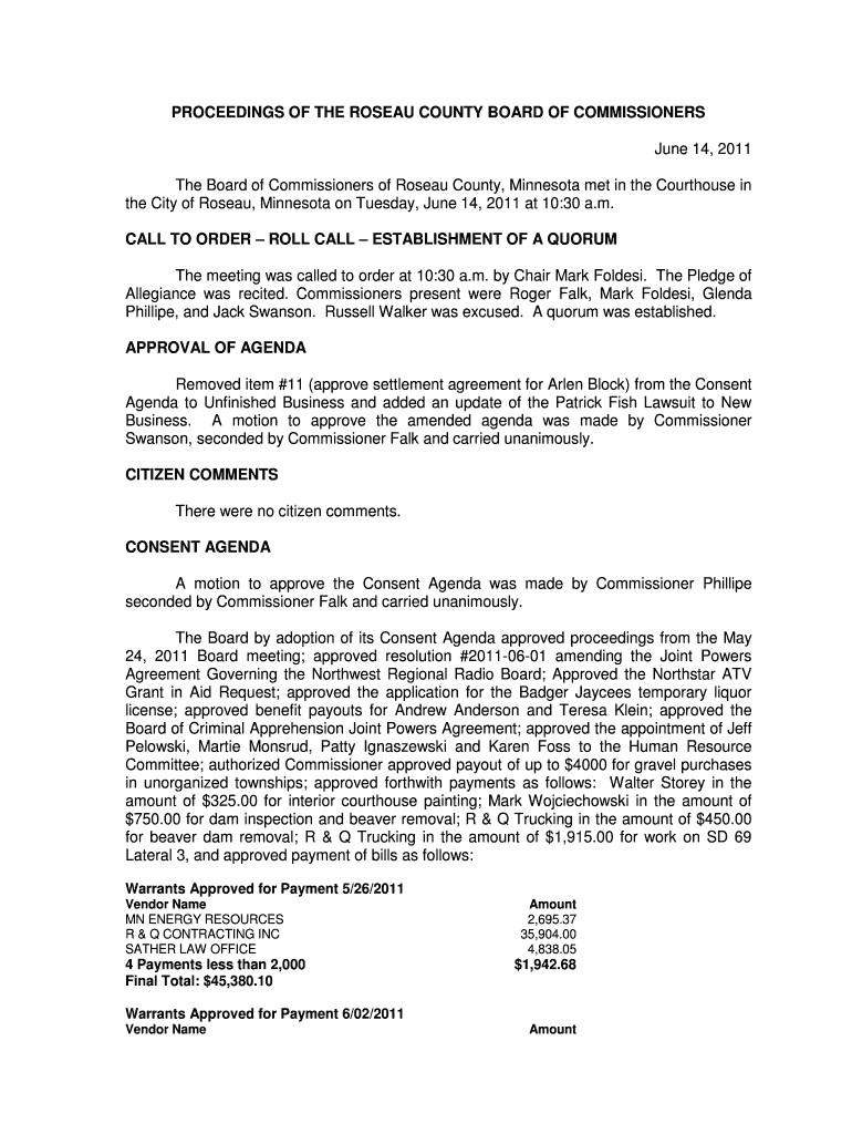 Minutes from the Roseau County Board of Commissioners meeting covering various agenda items, approvals, committee reports, and legal matters discussed during the meeting on June 14, 2011.