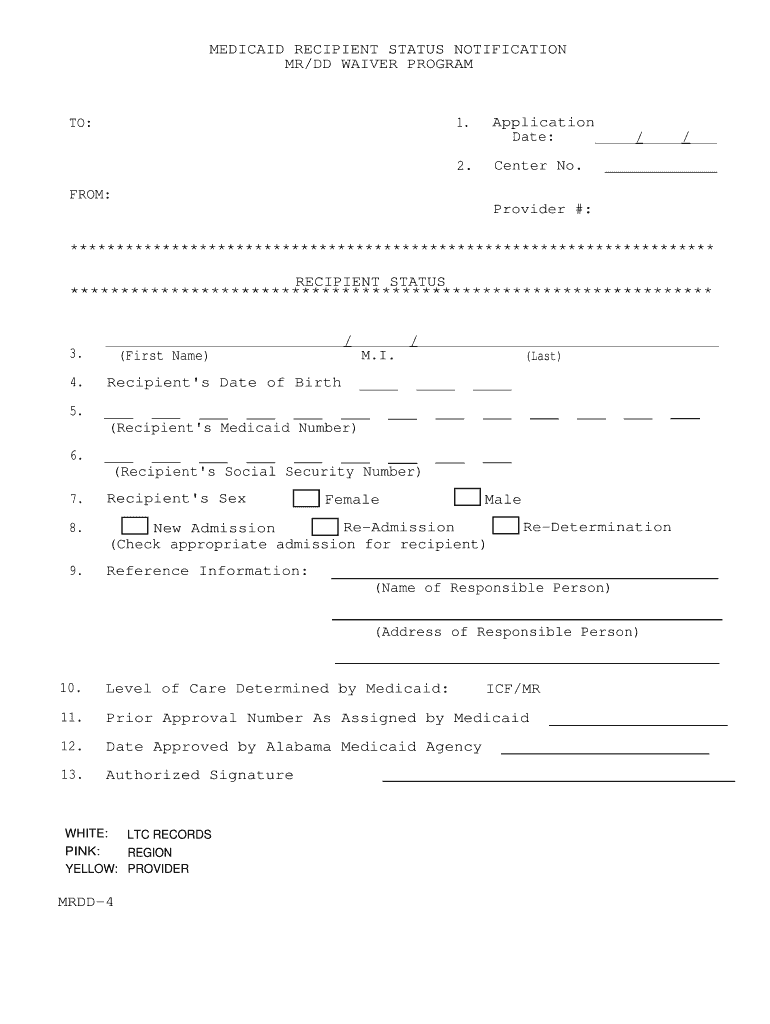 The Medicaid Recipient Status Notification is a government form used by providers to report the status of Medicaid recipients in the MR/DD Waiver Program in Alabama.