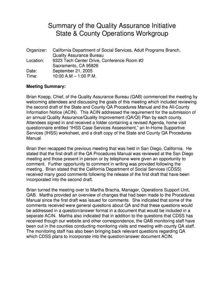 This document provides a summary of a meeting held by the California Department of Social Services regarding Quality Assurance and Quality Improvement plans, addressing QA procedures and related documentation