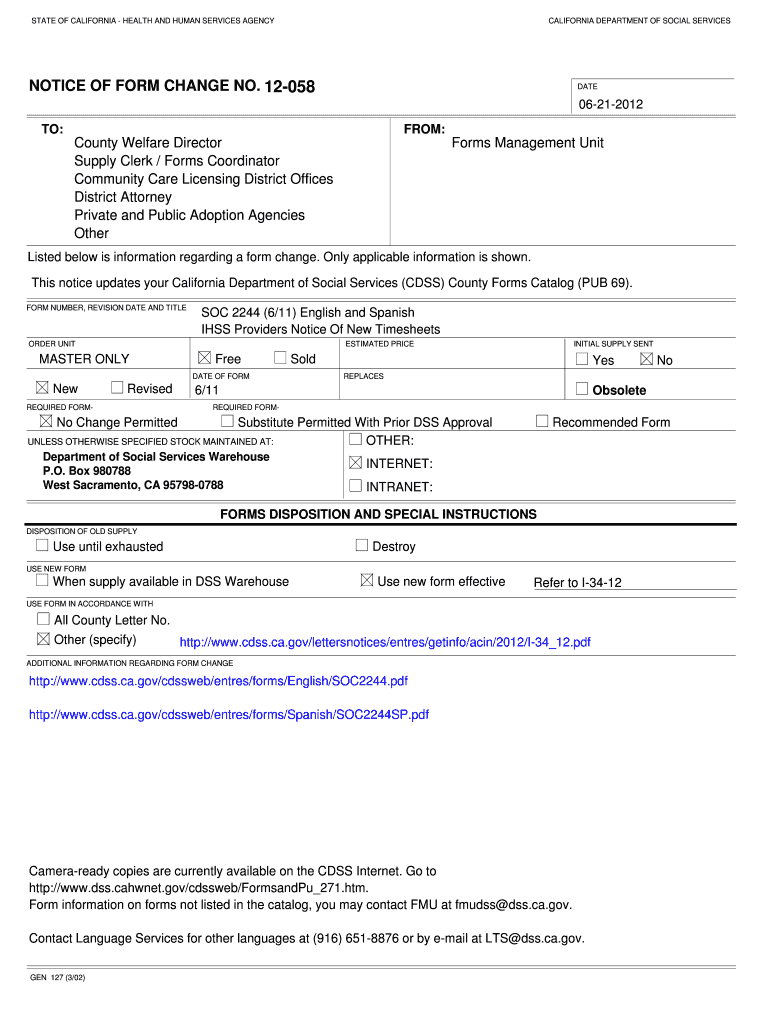 Get the free NOTICE OF FORM CHANGE NO. 12-058 - cdss ca