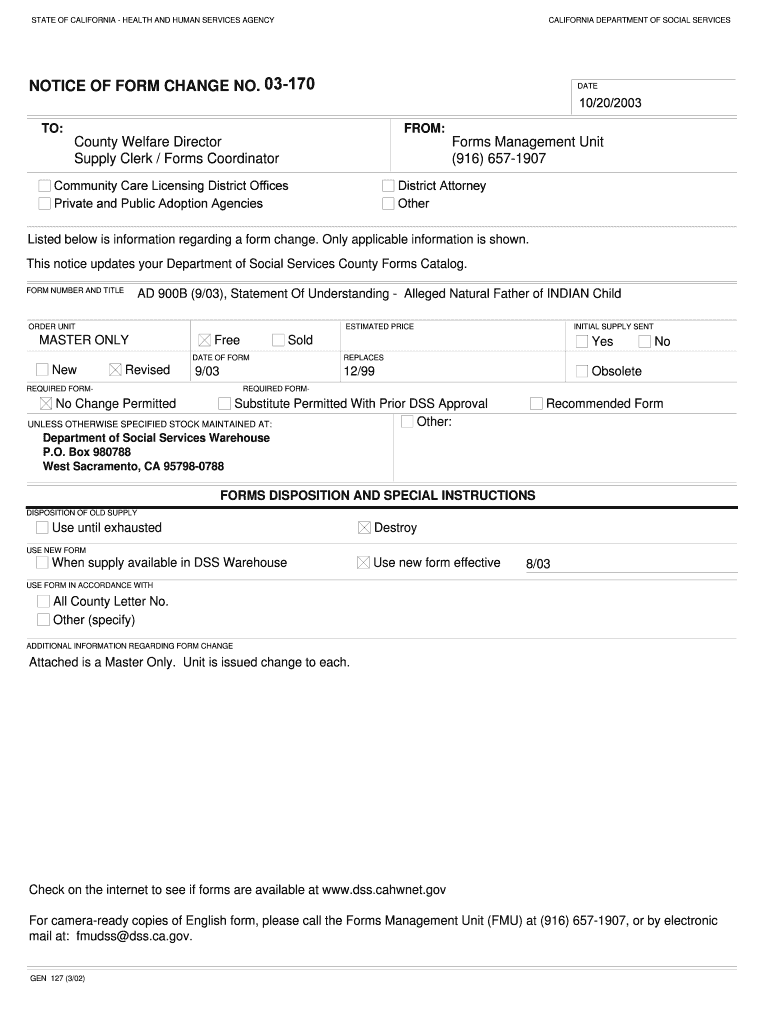 Get the free NOTICE OF FORM CHANGE NO. 03-170 - dss cahwnet