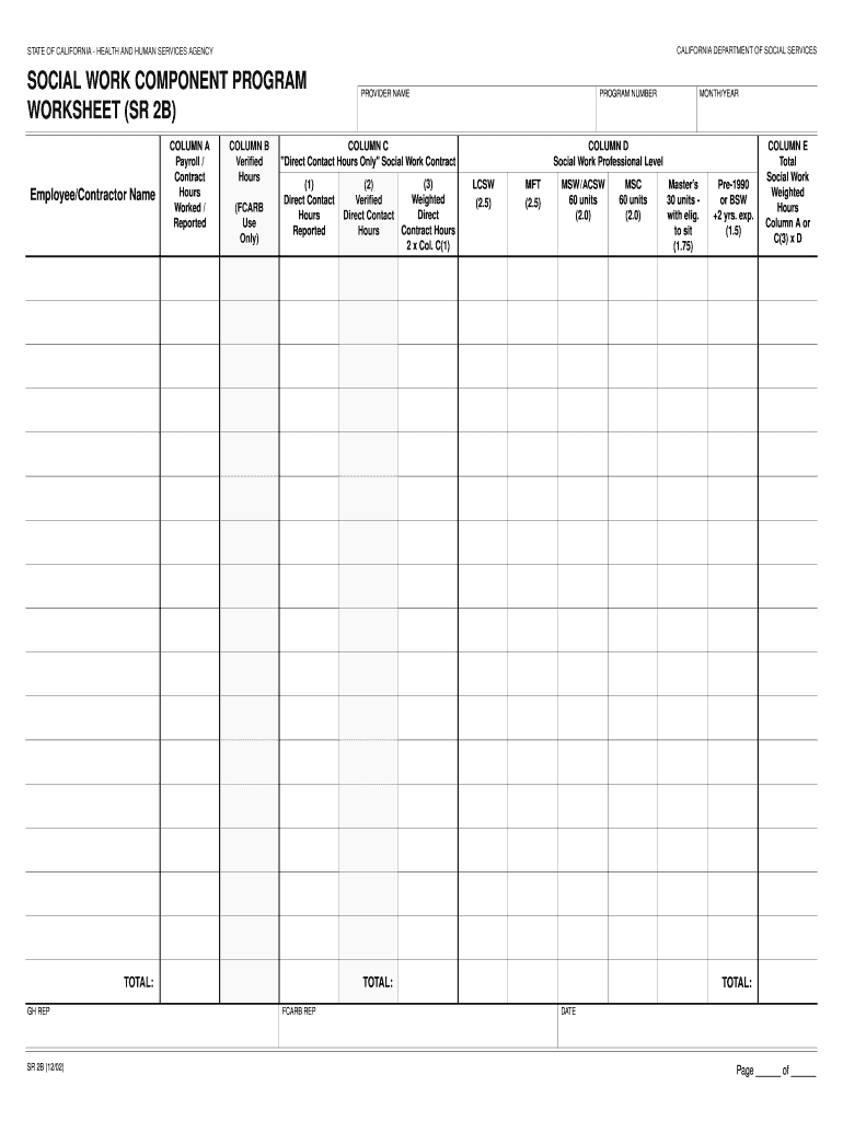 The California Social Work Component Program Worksheet (SR 2B) is a crucial form for providers in California, designed to report social work hours accurately. This worksheet plays an essential role in social work reporting within the state, ensuring that providers document their hours in compliance with regulatory requirements.