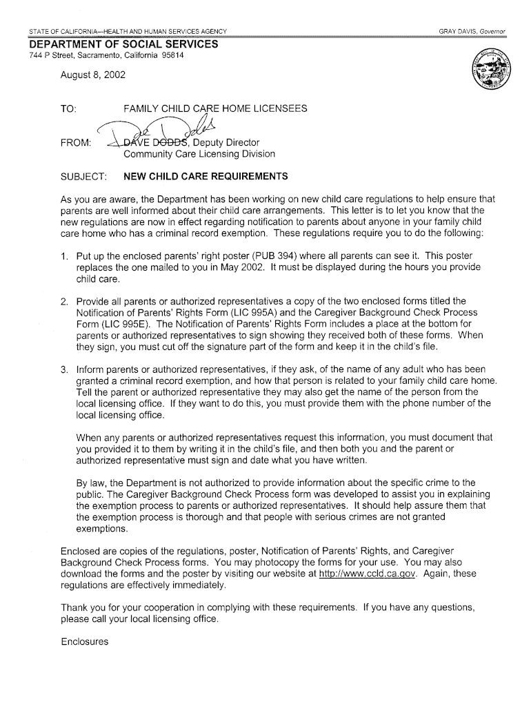 Get the free New Child Care Requirements - Home - California Department of ... - dss cahwnet