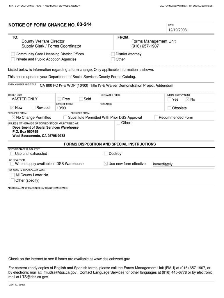 Get the free Notice of Form Change No. 03-244 - dss cahwnet