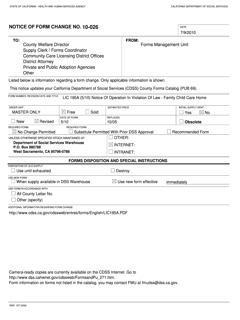 Get the free NOTICE OF FORM CHANGE NO. 10-026 - dss cahwnet