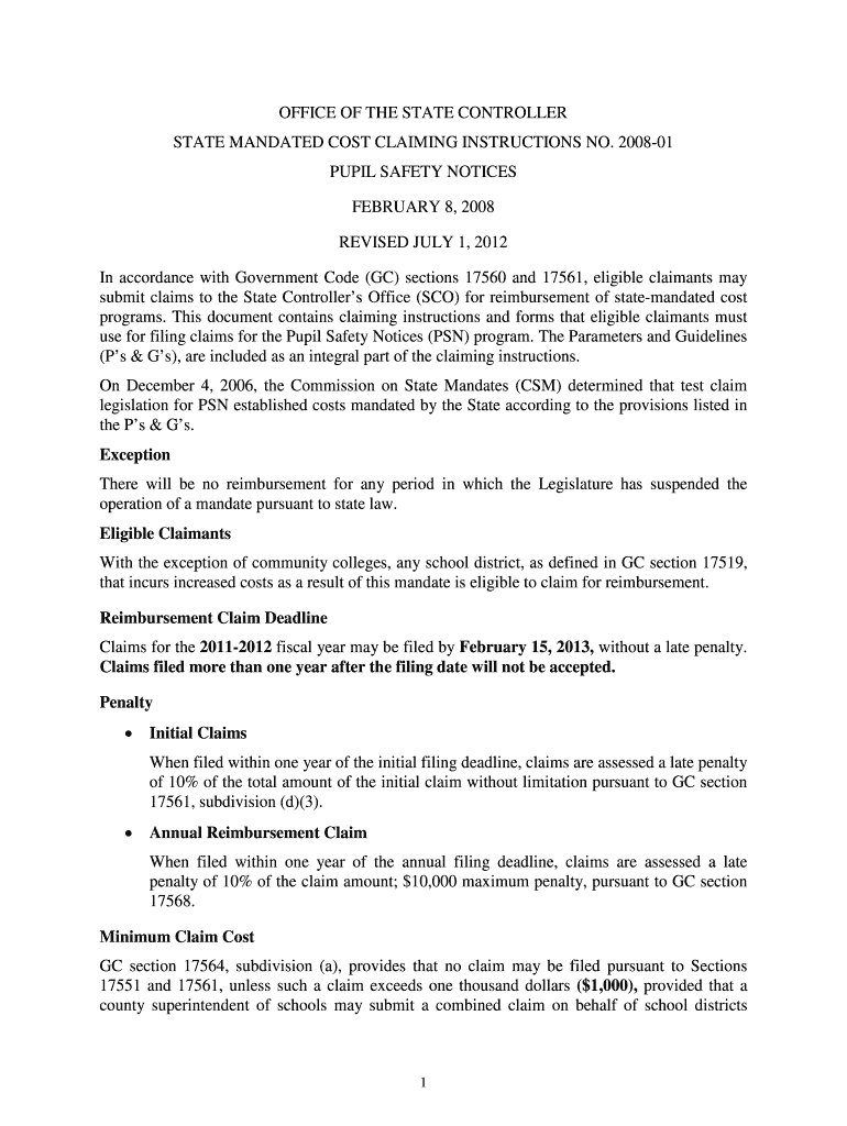 Obtain the STATE MANDATED COST CLAIMING INSTRUCTIONS NO. 2008-01 document from the relevant state agency.