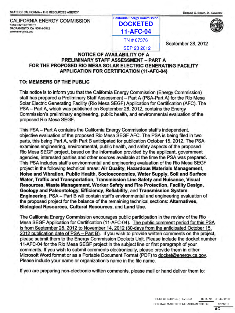 Get the free NOTICE OF AVAILABILITY OF A PRELIMINARY STAFF ASSESSMENT - PART A FOR THE PROPOSED R...