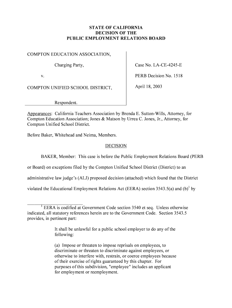 This document presents the findings and decision of the Public Employment Relations Board regarding a case involving the Compton Education Association and the Compton Unified School District. It discusses