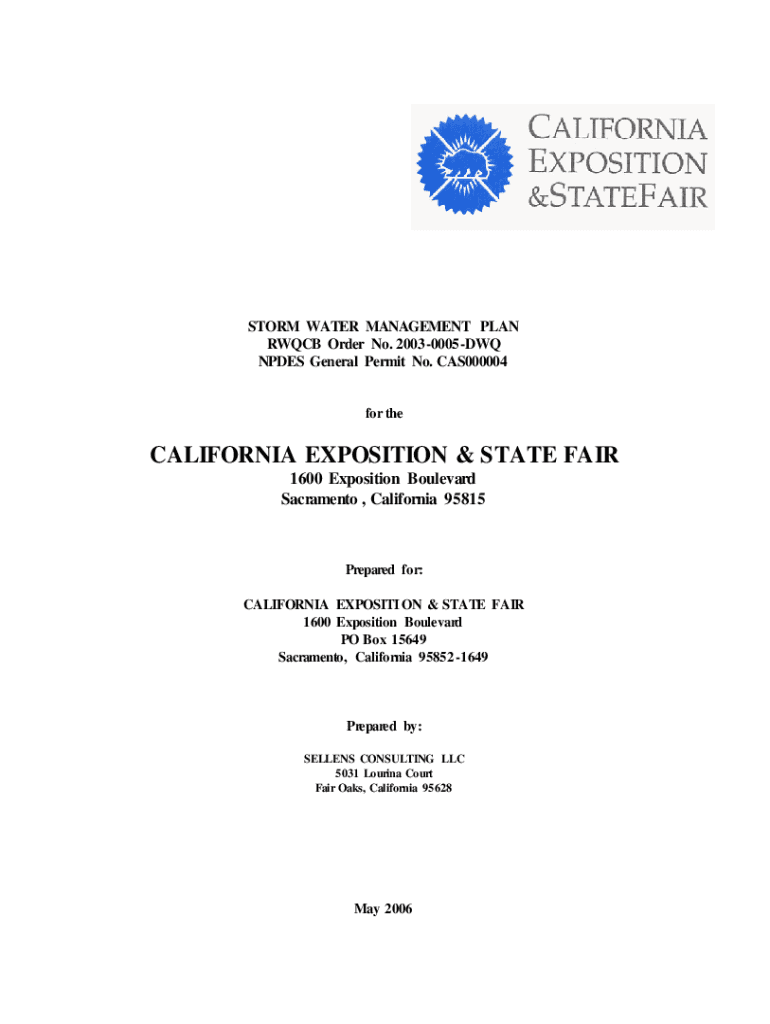 This document outlines the Storm Water Management Plan (SWMP) for the California Exposition and State Fair as required by RWQCB Order No. 2003-0005-DWQ. It details the measures to manage storm water