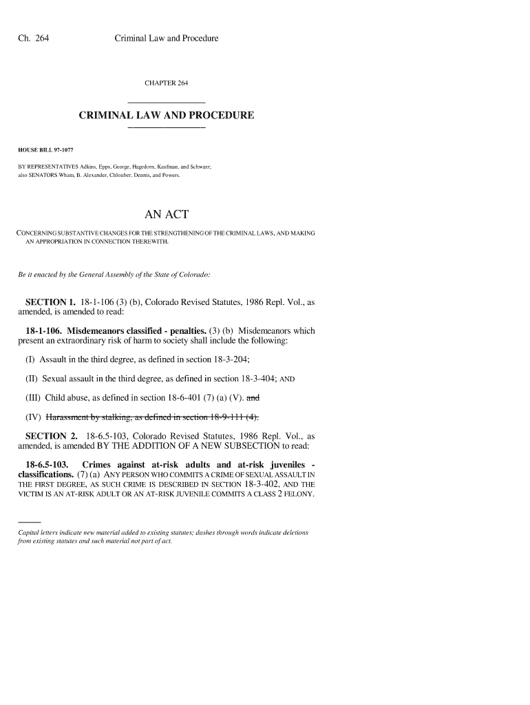 An act concerning substantive changes for the strengthening of the criminal laws, including definitions and penalties for various crimes, particularly relating to at-risk adults and juveniles.