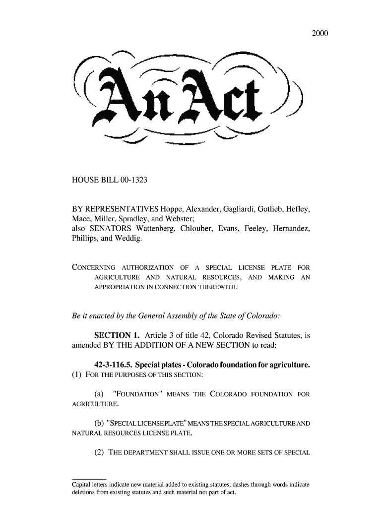 This document enacts legislation concerning the issuance of a special license plate for agriculture and natural resources in Colorado, detailing the requirements for application, qualifications for