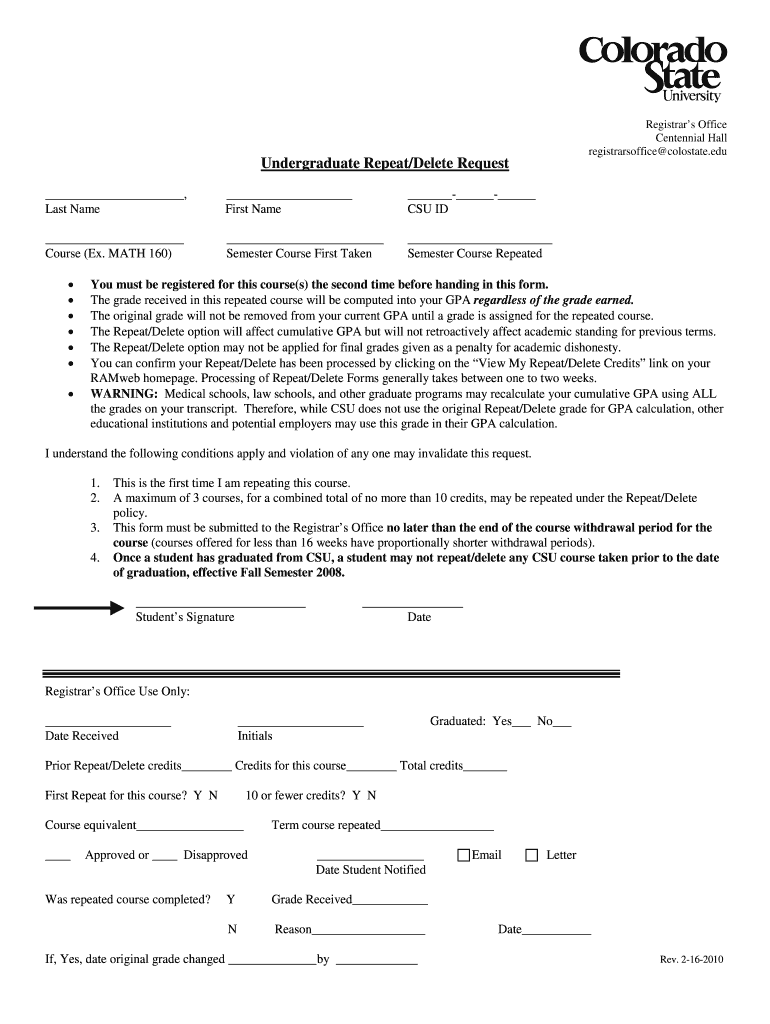The Colorado State University Undergraduate Repeat/Delete Request is a form used by undergraduate students to request the Repeat/Delete option for a course they are repeating.