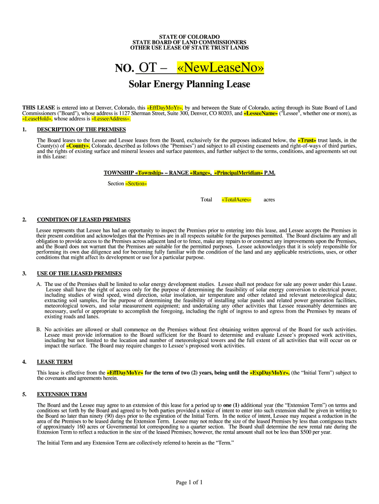 This document is a lease agreement between the State of Colorado, acting through its State Board of Land Commissioners, and the Lessee for the purpose of solar energy development studies on state