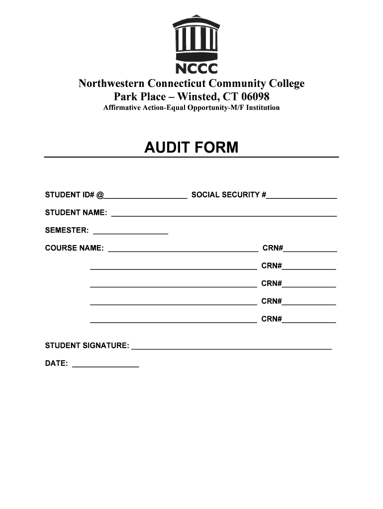 This form is used by students to audit their courses at Northwestern Connecticut Community College, requiring personal identification and course details.