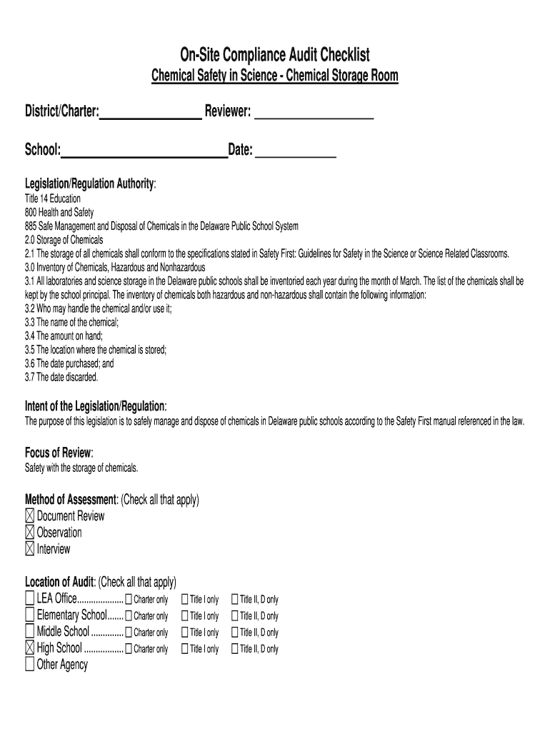 This document serves as a compliance audit checklist for assessing the safe storage and management of chemicals in Delaware public schools, ensuring adherence to safety regulations and guidelines.