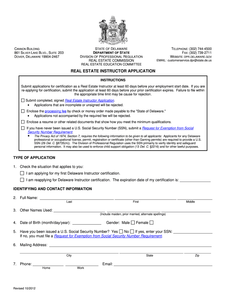 This document serves as an application for certification as a Real Estate Instructor in the State of Delaware, detailing instructions, required information, and conditions for application submission.