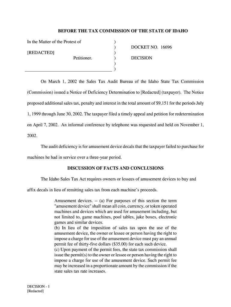 Get the free 16696 DECISION On March 1, 2002 the Sales Tax Audit Bureau of the Idaho State Tax Co...