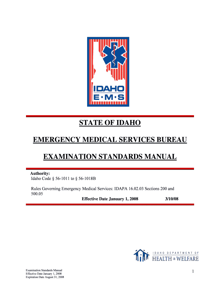 This document outlines the examination standards and procedures for Emergency Medical Services (EMS) certification in Idaho, including eligibility, examination formats, registration processes, and