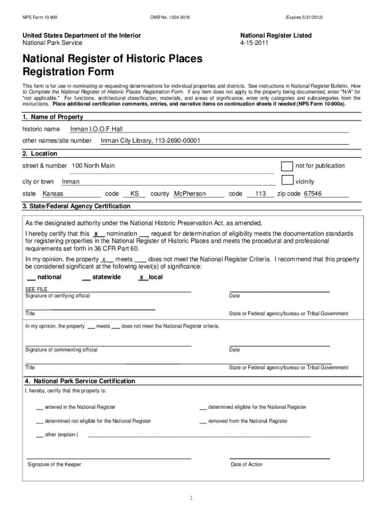 This form is used for nominating individual properties and districts to the National Register of Historic Places, documenting the significance, location, and structure of said properties.