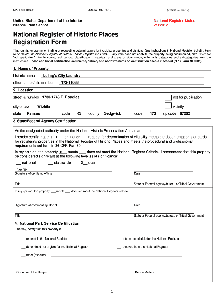 NPS Form 10-900 is the official application form used for nominating properties to the National Register of Historic Places.