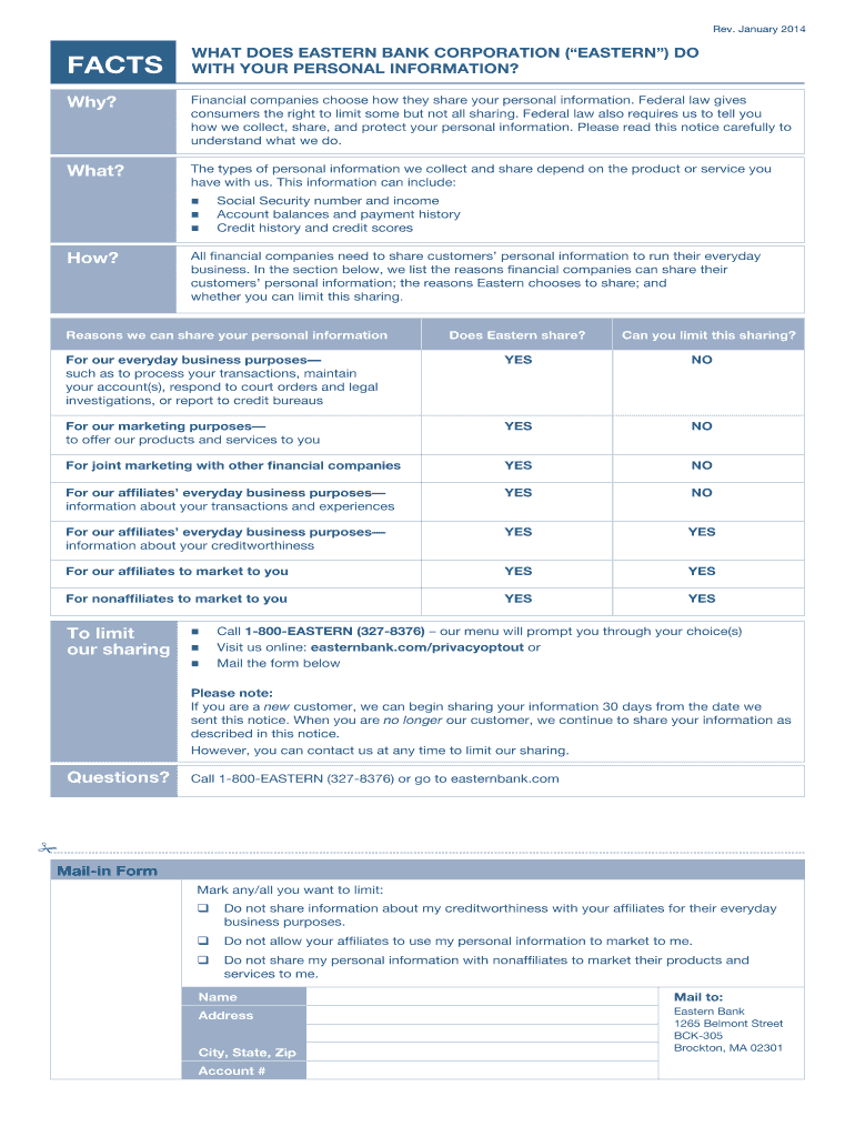 Any customer of Eastern Bank Corporation or individuals wishing to limit personal information sharing can use the Eastern Bank Privacy Notice form.