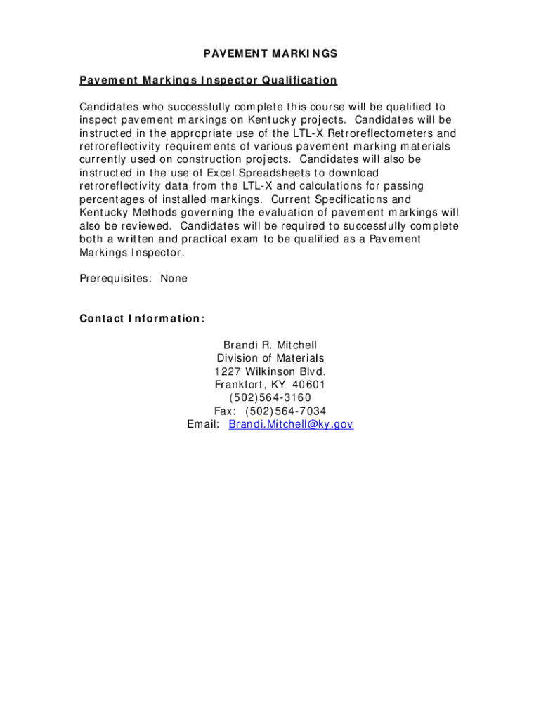 Get the free PAVEMENT MARKINGS INSPECTOR QUALIFICATION - transportation ky