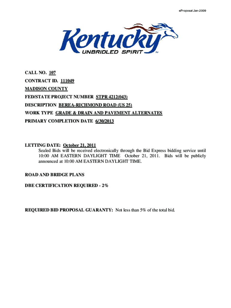 This document provides details and requirements for the construction contract involving grade, drain, and pavement alternates on Berea-Richmond Road in Madison County, specifying project scope, deadlines,
