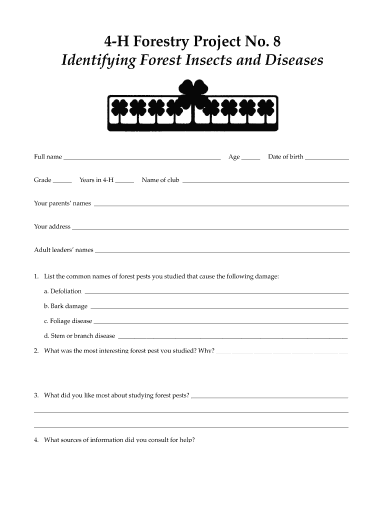 The 4-H Forestry Project: Identifying Forest Insects and Diseases is an educational form used by 4-H members in Mississippi to identify forest pests and diseases.