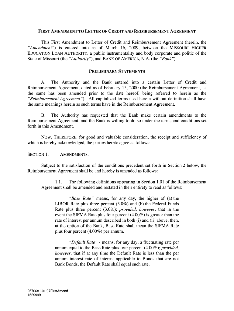 This document serves as an amendment to the Letter of Credit and Reimbursement Agreement between the Missouri Higher Education Loan Authority and Bank of America, outlining changes to definitions,