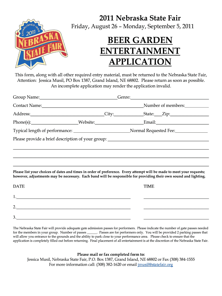 Get the free 2011 Nebraska State Fair Beer Garden Entertainment Application - statefair