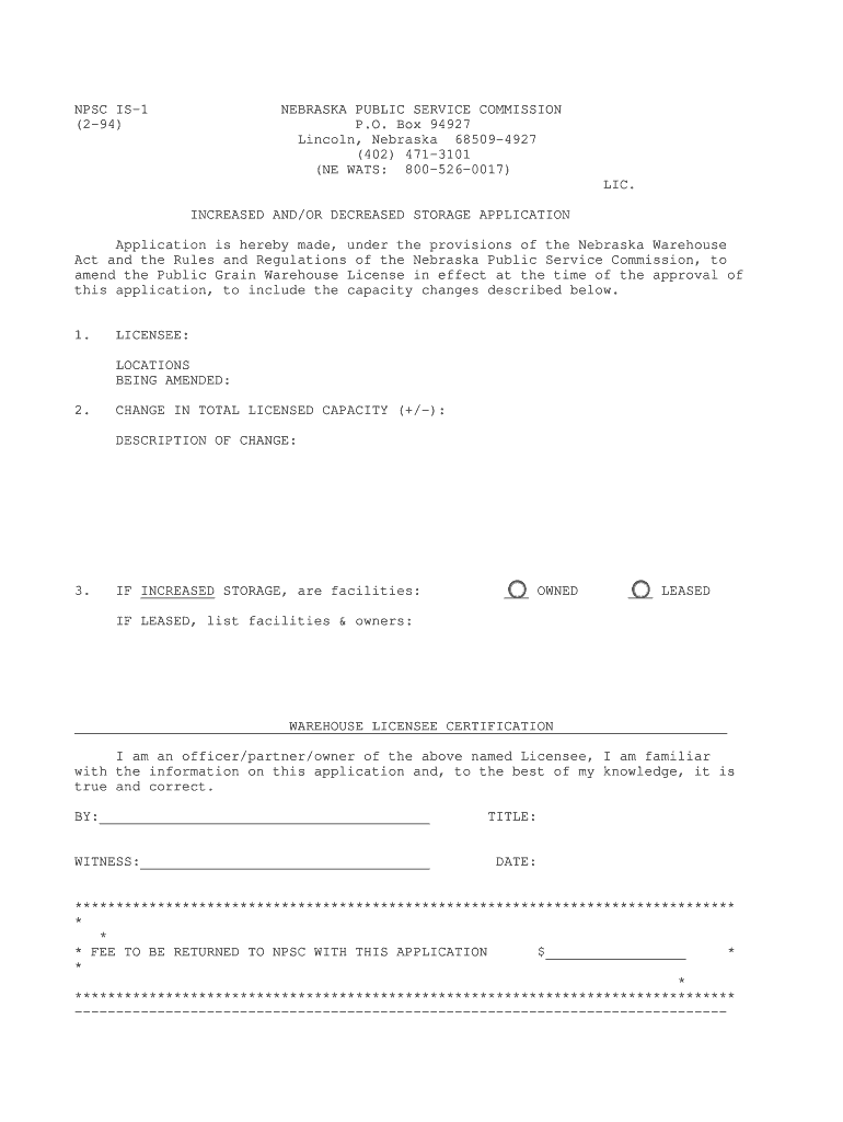 This document is an application to amend the Public Grain Warehouse License for changes in storage capacity under the Nebraska Warehouse Act and the Nebraska Public Service Commission regulations.
