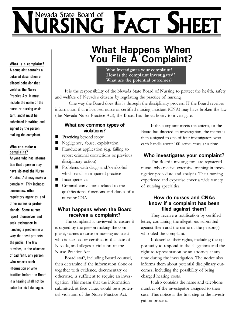 This document provides detailed information about the complaint process related to alleged violations of the Nurse Practice Act by nurses and nursing assistants in Nevada, including who can file complaints,