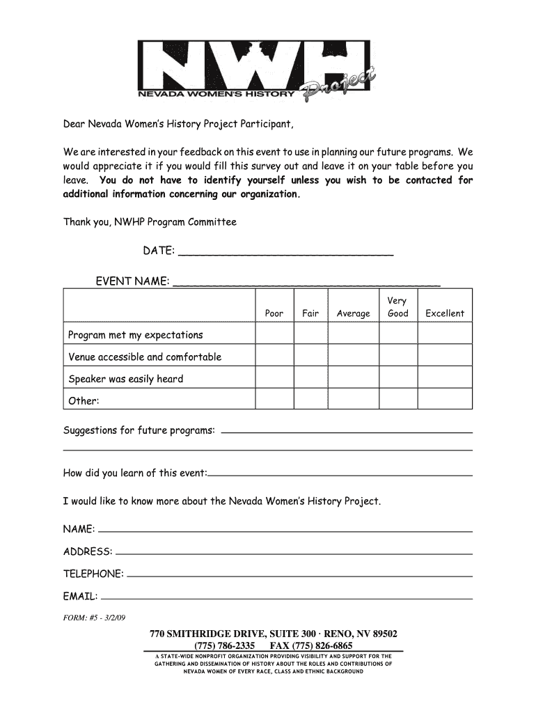 This document is a feedback survey for participants of the Nevada Women’s History Project event to gather their opinions for future program planning.