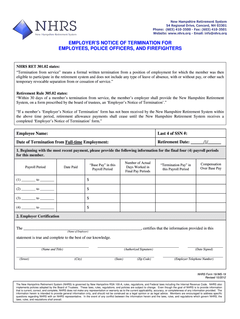Employees who are members of the New Hampshire Retirement System and wish to document their service or contributions are required to file NHRS Form 19//MS-19.