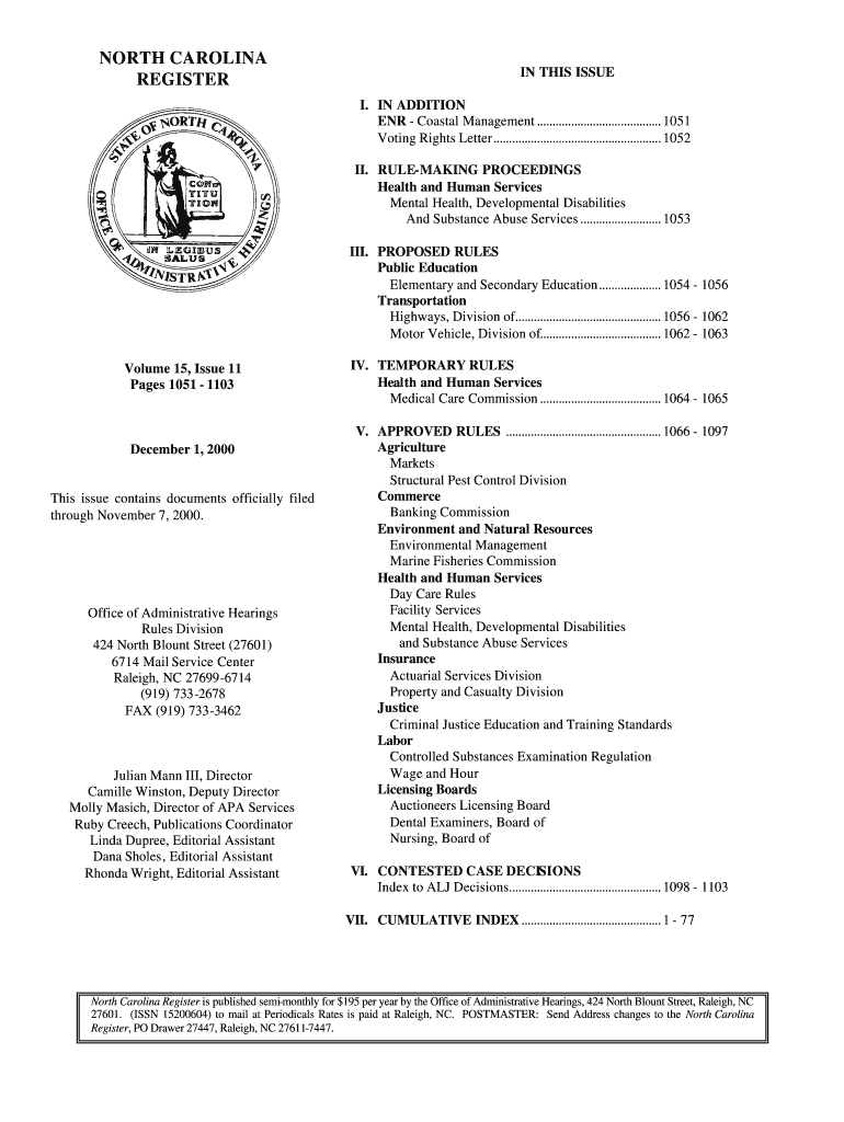 This document is the North Carolina Register, which publishes administrative rules, notices, and proceedings for the state of North Carolina. It includes various sections such as rule-making proceedings,