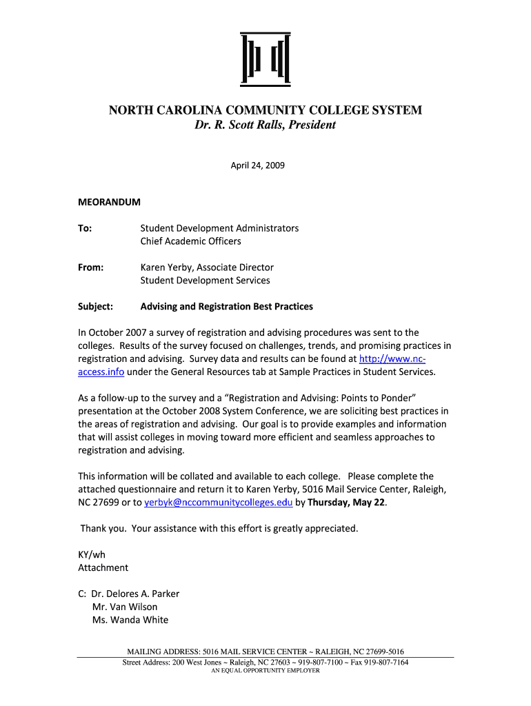 This memorandum solicits best practices from colleges in the areas of registration and academic advising, following a survey conducted in October 2007. The goal is to improve efficiency and provide