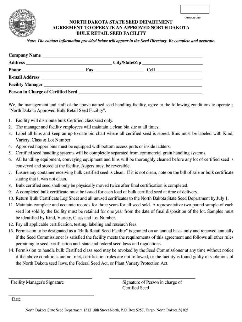 Get the free NORTH DAKOTA BULK RETAIL SEED FACILITY AGREEMENT - nd