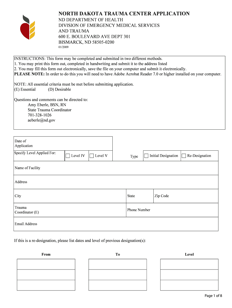 Any healthcare facility that wishes to be recognized as a trauma center by the state of North Dakota is required to file the NORTH DAKOTA TRAUMA CENTER APPLICATION.