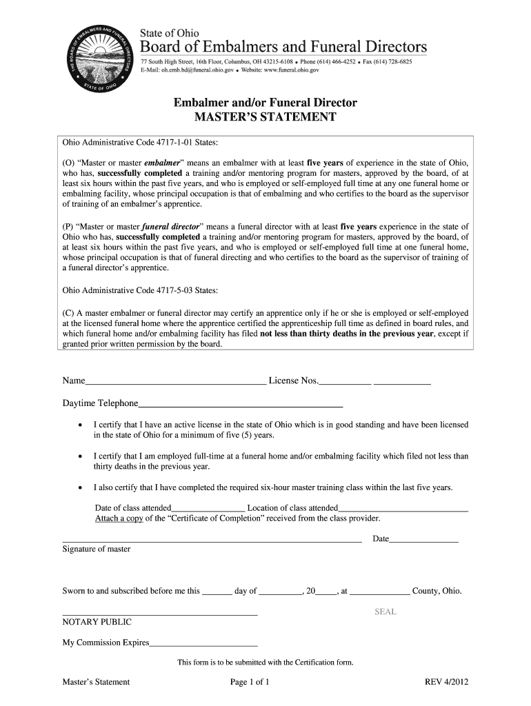 Embalmer and/or Funeral Director MASTER IS STATEMENT Ohio Administrative Code 4717-1-01 States: (O) Master or master embalmer means an embalmer with at least five years of experience in the state