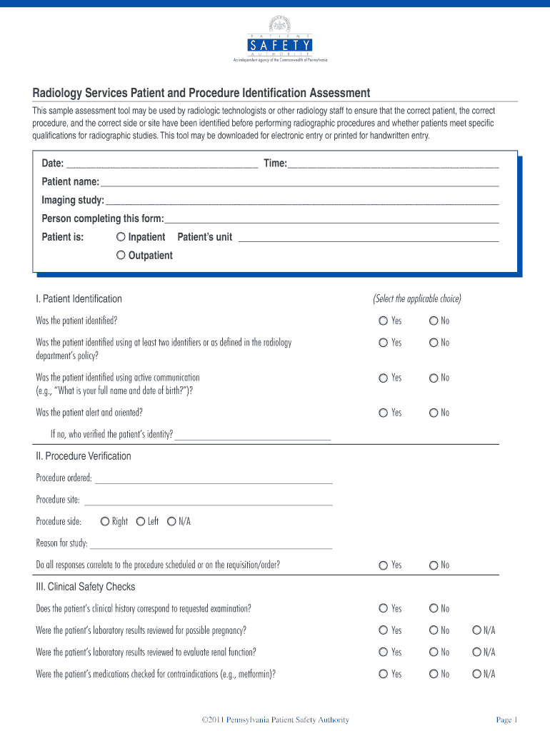 The Radiology Patient Procedure Identification Assessment is a medical form used by radiologic technologists to verify patient identity and procedure details before radiographic procedures.
