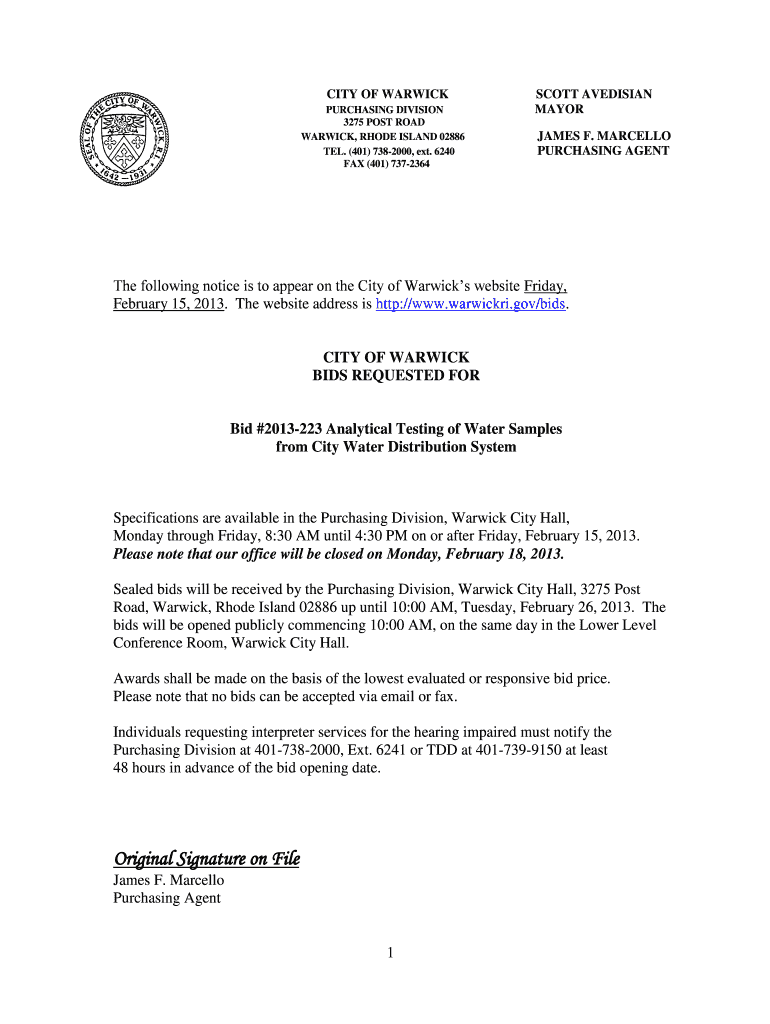 Get the free Bid #2013-223 Analytical Testing of Water Samples from City Water Distribution Syste...