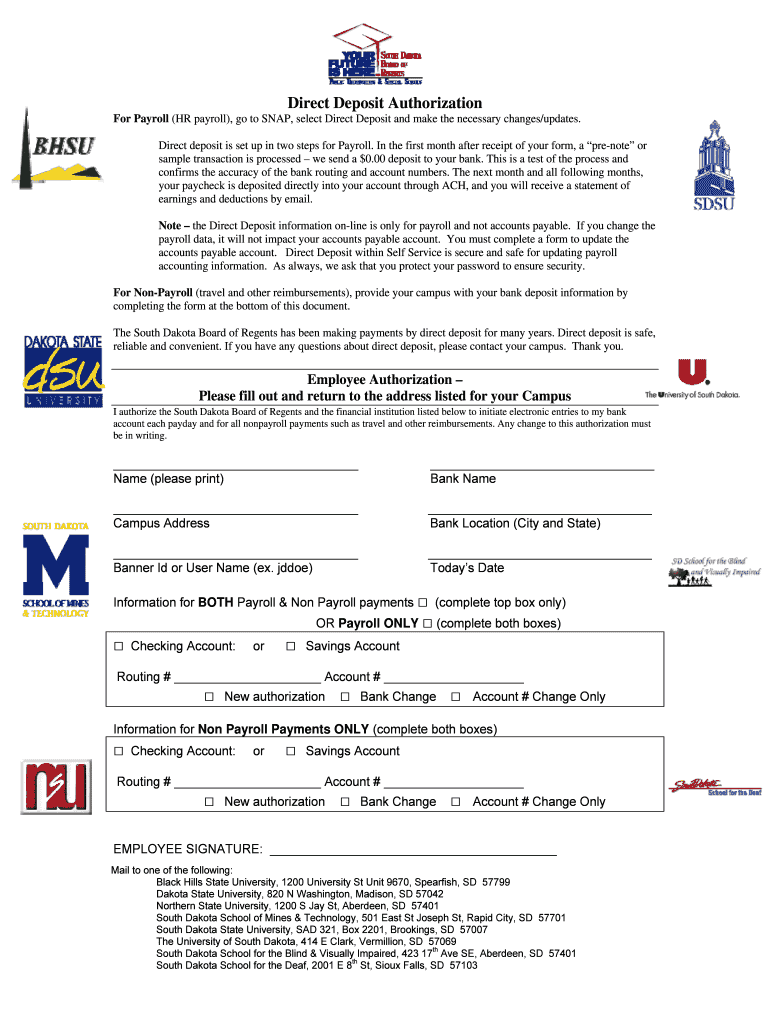 Employees of the South Dakota Board of Regents are eligible to complete the Direct Deposit Authorization Form to set up or update their direct deposit information.