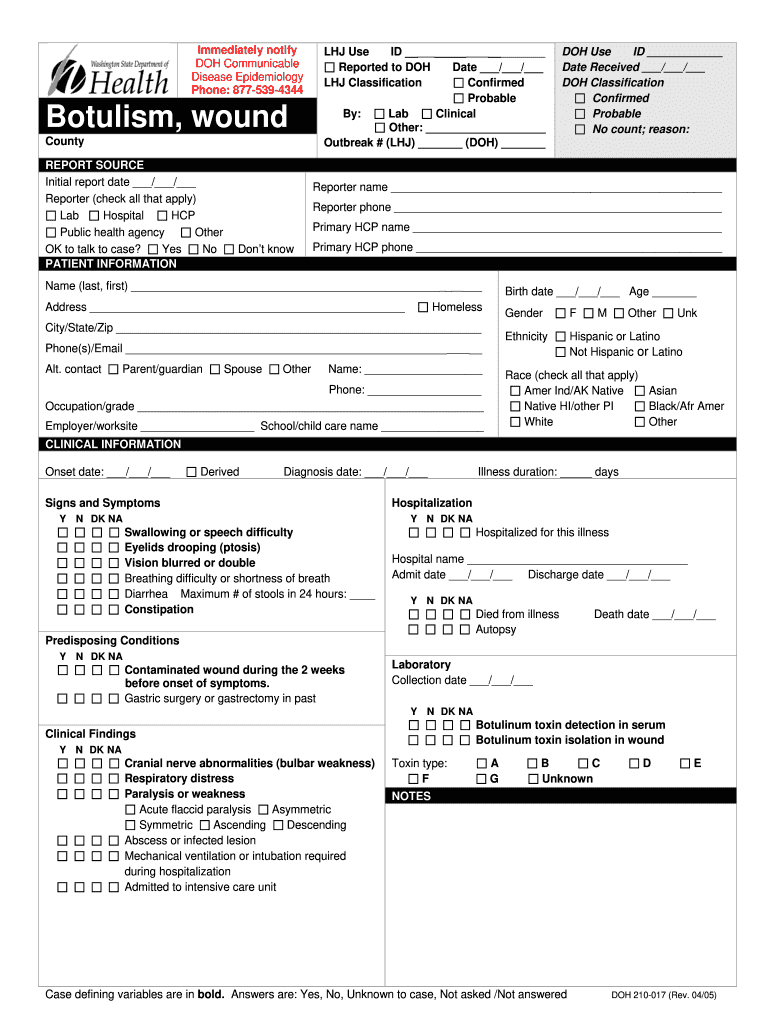 Immediately notify DOH Communicable Disease Epidemiology Phone: 877-539-4344 Botulism, wound County REPORT SOURCE Initial report date / / Reporter (check all that apply) Lab Hospital HCP Public health