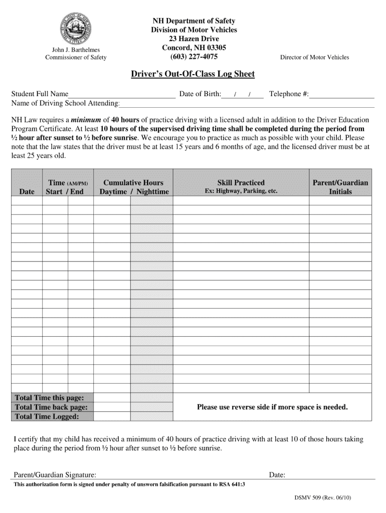 John J. Barthelmes Commissioner of Safety NH Department of Safety Division of Motor Vehicles 23 Hazen Drive Concord, NH 03305 (603) 227-4075 Director of Motor Vehicles Driver's Out-Of-Class Log Sheet