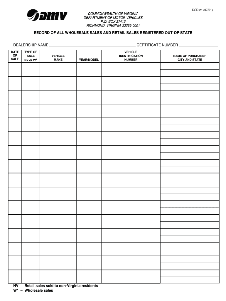 This document serves as a record for dealerships in Virginia to log all wholesale and retail vehicle sales made to out-of-state purchasers.