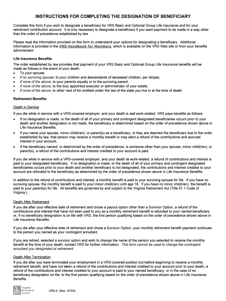 Instructions for filling out the Virginia Retirement System Beneficiary Designation Form can typically be found within the form itself or on the Virginia Retirement System website.