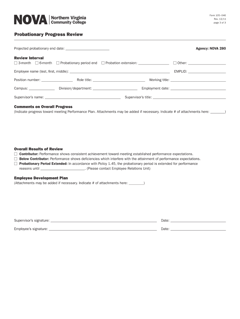 The Probationary Progress Review (Form 105–046) is used to assess a probationary employee’s performance during the initial 12 months of employment, outlining procedures for conducting reviews,